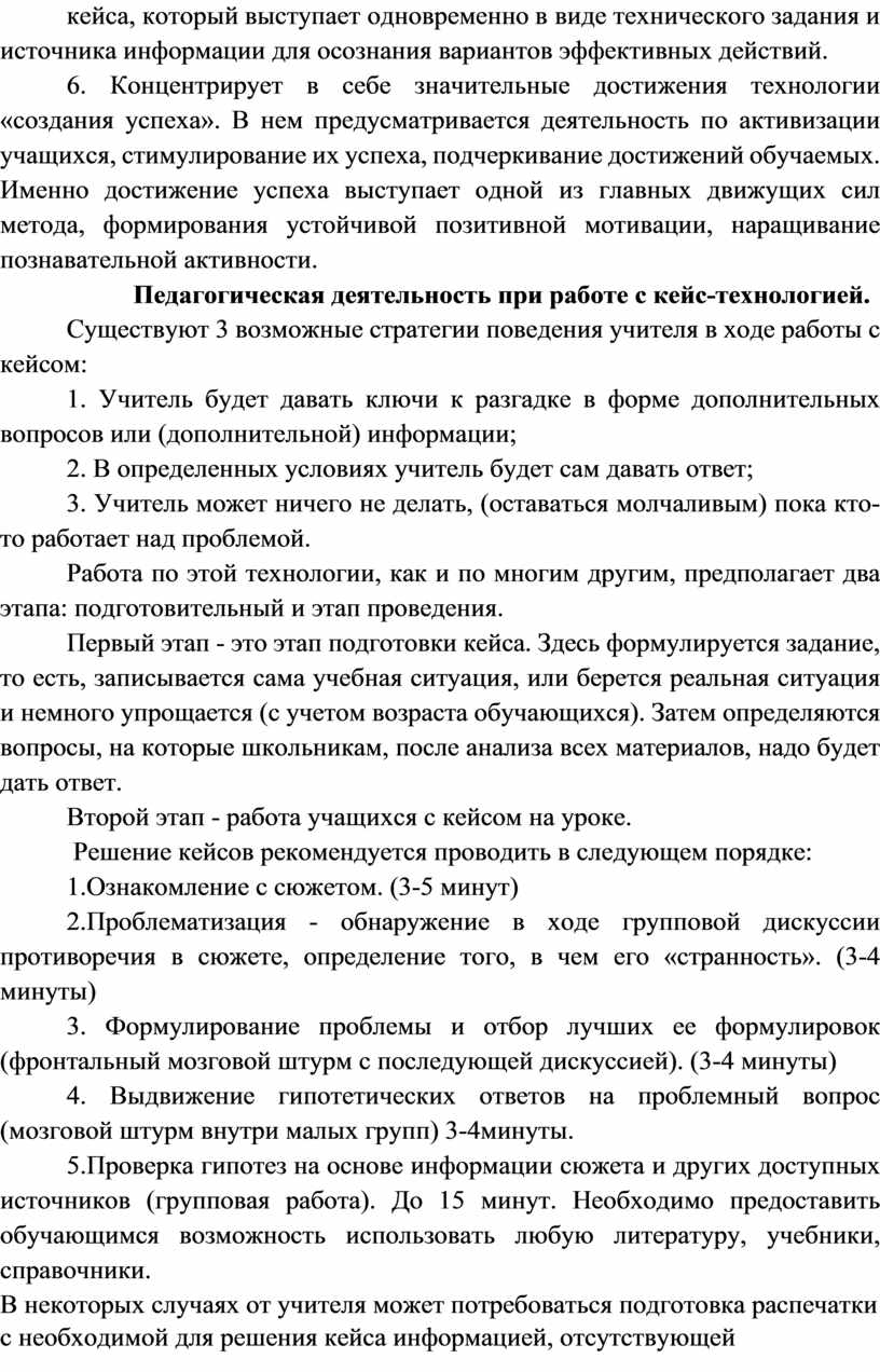 В организации такого рода деятельности одной из перспективных технологий обучении становится так называемая кейс-технология (case-study). Эта технология представляет собой синтез проблемного обучения, информационно-коммуникативных технологий, метода проектов.