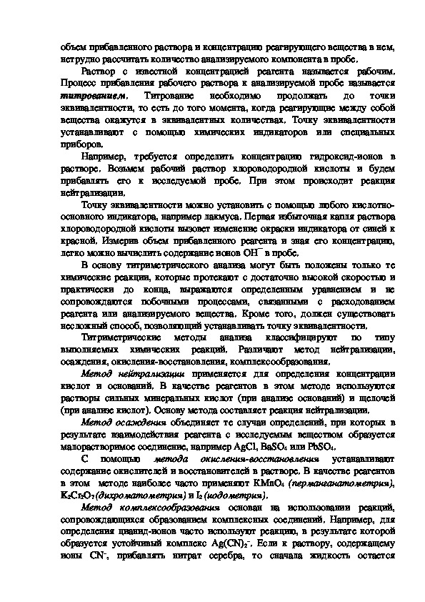 этом концентрация реагента должна быть предварительно установлена. Знаяобъем прибавленного раствора и концентрацию реагирующего вещества в нем,