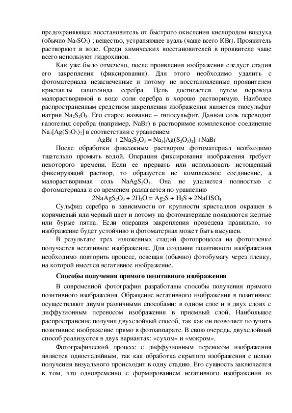 (обычно Na2SO3) ; вещество, устраняющее вуаль (чаще всего КВr). Проявитель