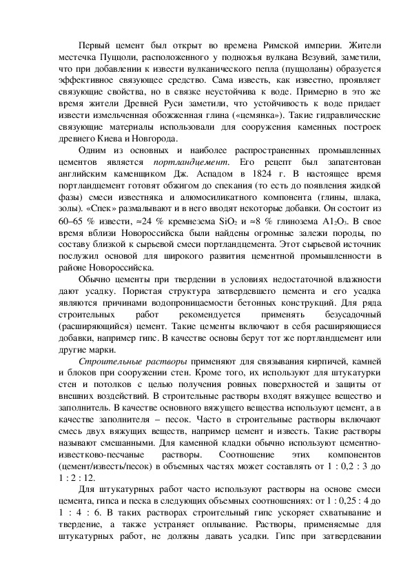 которые, начав твердеть на воздухе, продолжают твердеть и под водой.Первый цемент был открыт во времена Римской империи. Жители