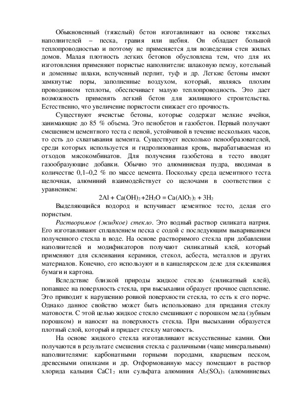 химическое взаимодействие с вяжущим веществом и водой.Обыкновенный (тяжелый) бетон изготавливают на основе тяжелых