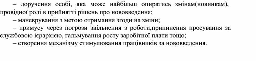 – доручення особі, яка може найбільш опиратись змінам(новинкам), провідної ролі в прийнятті рішень про нововведення;