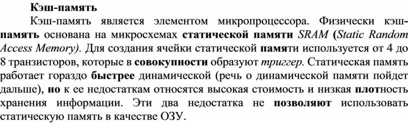 Кэш-память является элементом микропроцессора. Физически кэш-память основана на микросхемах статической памяти SRAM (Static Random Access Memory). Для создания ячейки статической памяти используется от 4 до 8 транзисторов, которые в совокупности образуют триггер. Статическая память работает гораздо быстрее динамической (речь о динамической памяти пойдет дальше), но к ее недостаткам относятся высокая стоимость и низкая плотность хранения информации. Эти два недостатка не позволяют использовать статическую память в качестве ОЗУ.