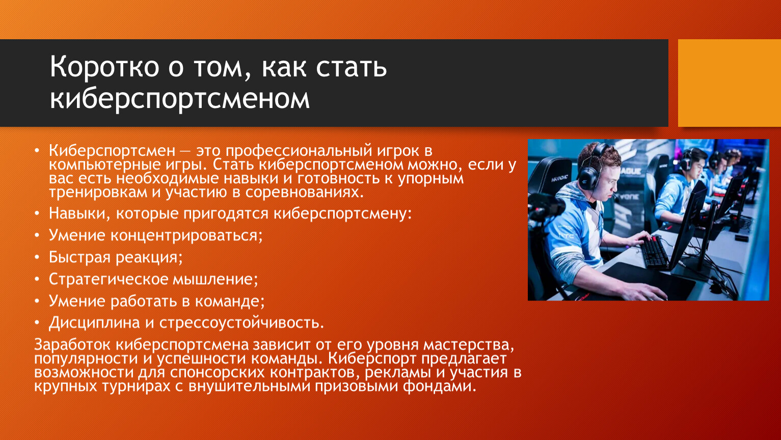Киберспортсмен — это профессиональный игрок в компьютерные игры. Стать киберспортсменом можно, если у вас есть необходимые навыки и готовность к упорным тренировкам и участию в соревнованиях.