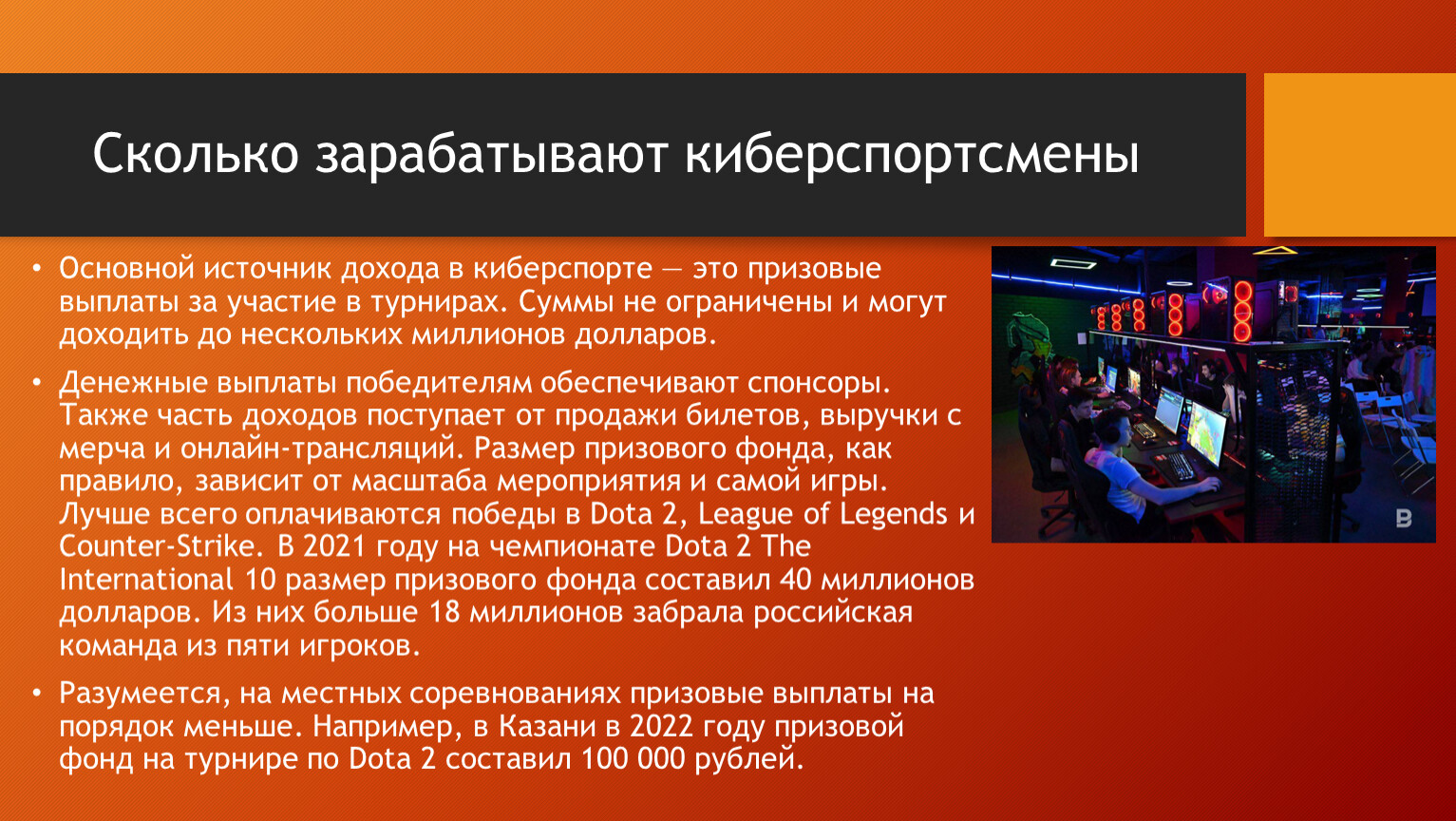 Разумеется, на местных соревнованиях призовые выплаты на порядок меньше. Например, в Казани в 2022 году призовой фонд на турнире по Dota 2 составил 100 000 рублей.