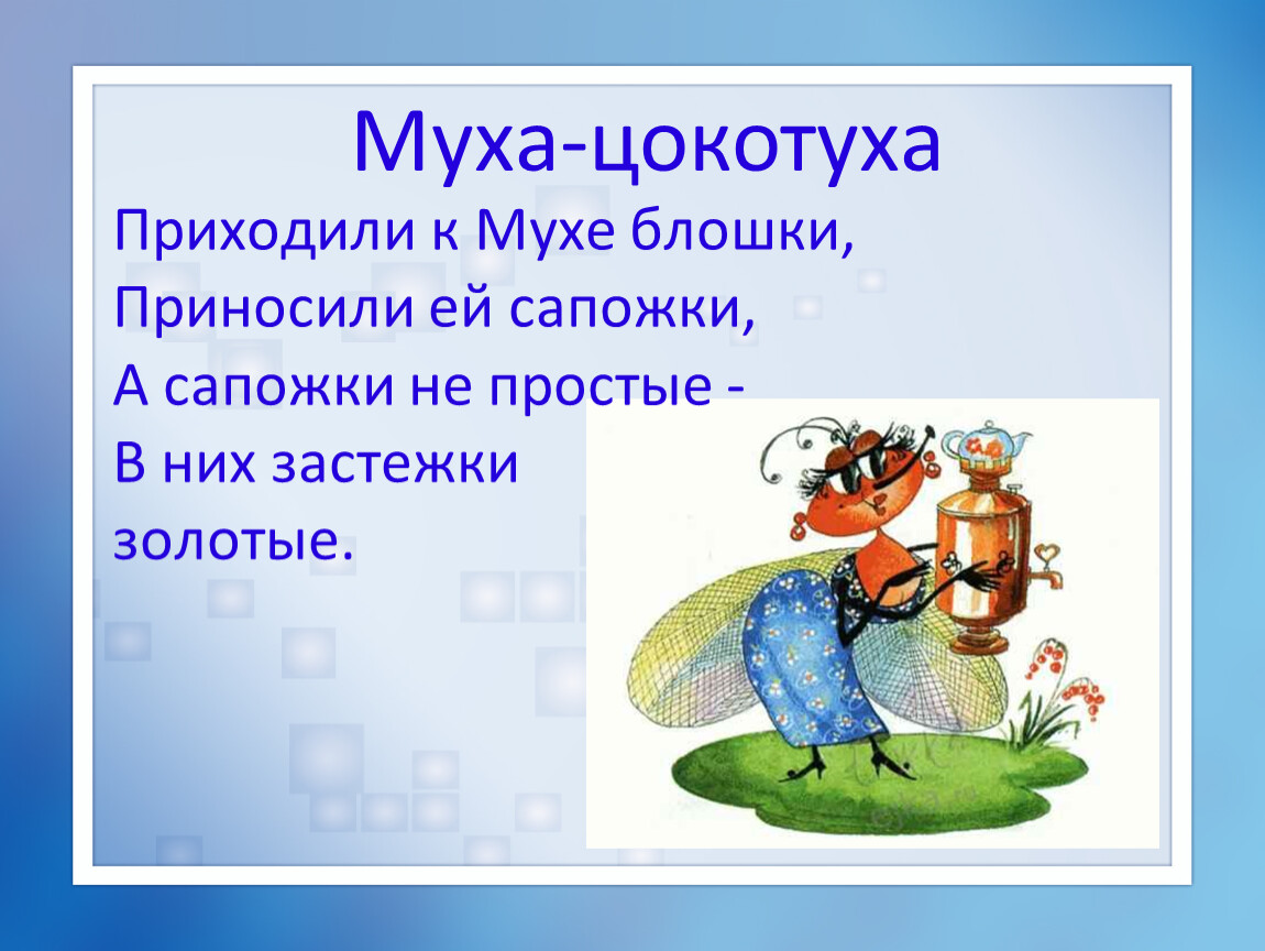 Приходили к Мухе блошки,Приносили ей сапожки,А сапожки не простые -В них застежки золотые.