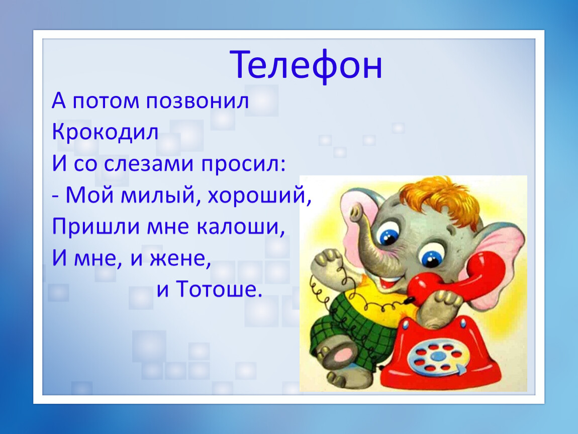 А потом позвонилКрокодилИ со слезами просил:- Мой милый, хороший,Пришли мне калоши,И мне, и жене, и Тотоше.