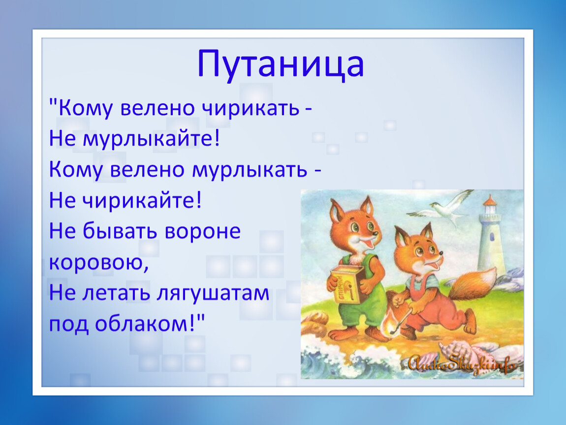 "Кому велено чирикать -Не мурлыкайте!Кому велено мурлыкать -Не чирикайте!Не бывать вороне коровою,Не летать лягушатам под облаком!"