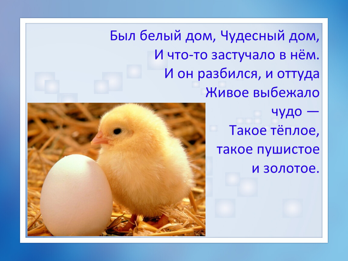 Был белый дом, Чудесный дом,И что-то застучало в нём.И он разбился, и оттудаЖивое выбежало чудо —Такое тёплое, такое пушистое и золотое.