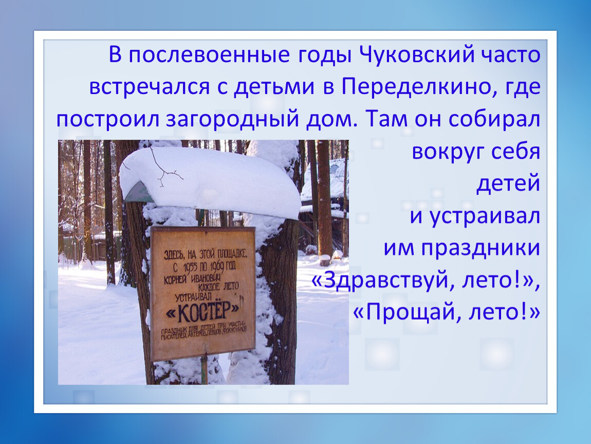 В послевоенные годы Чуковский часто встречался с детьми в Переделкино, где построил загородный дом. Там он собирал вокруг себя детей и устраивал им праздники «Здравствуй, лето!», «Прощай, лето!»