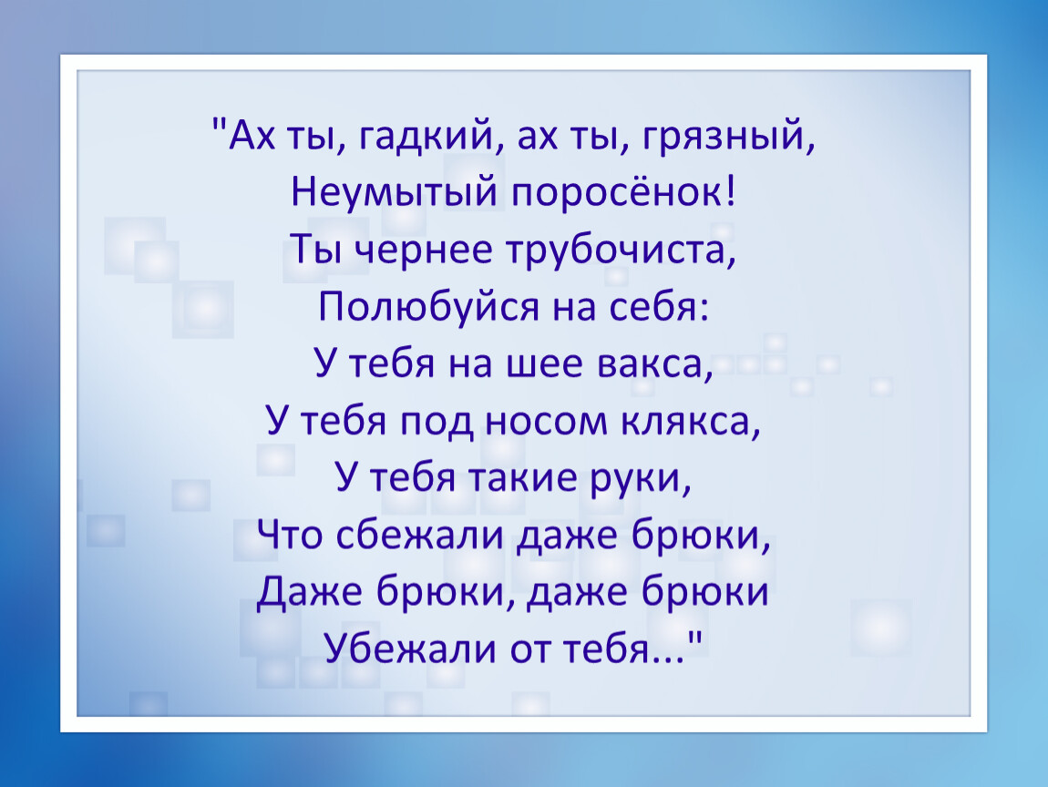 "Ах ты, гадкий, ах ты, грязный,Неумытый поросёнок!Ты чернее трубочиста,Полюбуйся на себя:У тебя на шее вакса,У тебя под носом клякса,У тебя такие руки,Что сбежали даже брюки,Даже брюки, даже брюкиУбежали от тебя..."