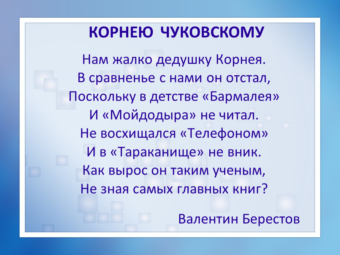 Нам жалко дедушку Корнея.В сравненье с нами он отстал,Поскольку в детстве «Бармалея»И «Мойдодыра» не читал.Не восхищался «Телефоном»И в «Тараканище» не вник.Как вырос он таким ученым,Не зная самых главных книг?