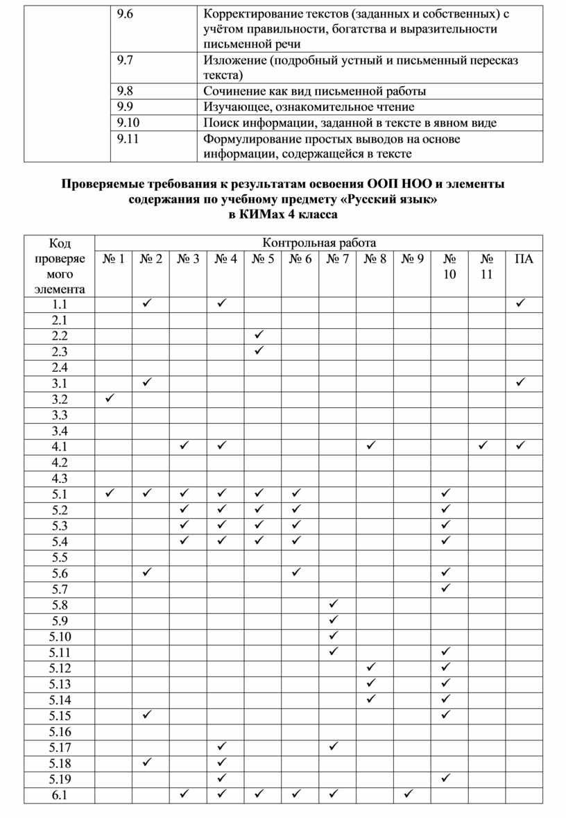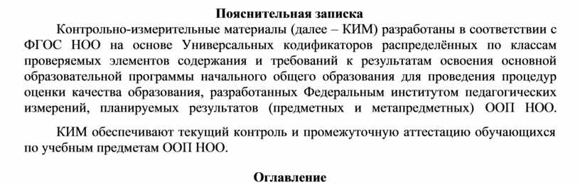 Контрольно-измерительные материалы (далее – КИМ) разработаны в соответствии с ФГОС НОО на основе Универсальных кодификаторов распределённых по классам проверяемых элементов содержания и требований к результатам освоения основной образовательной программы начального общего образования для проведения процедур оценки качества образования, разработанных Федеральным институтом педагогических измерений, планируемых результатов (предметных и метапредметных) ООП НОО.