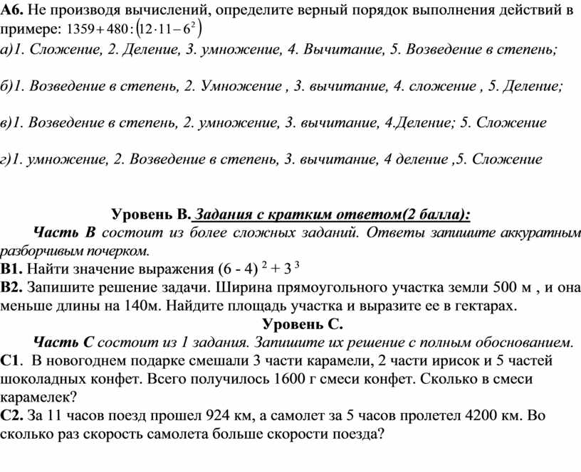 б) 1.Деление, 2.Возведение в степень, 3.Сложение, 4.Умножение, 5. Вычитание;