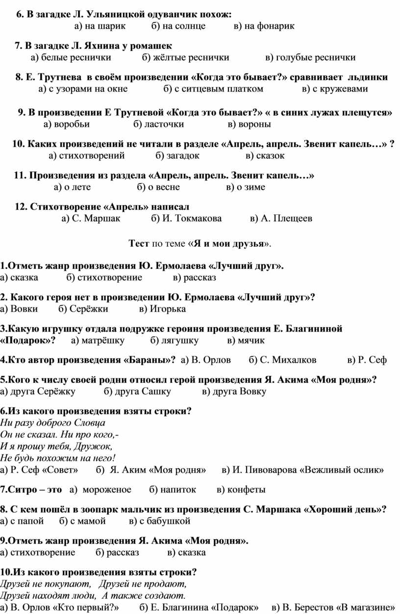 Тест по теме «Апрель, апрель. Звенит капель…»
