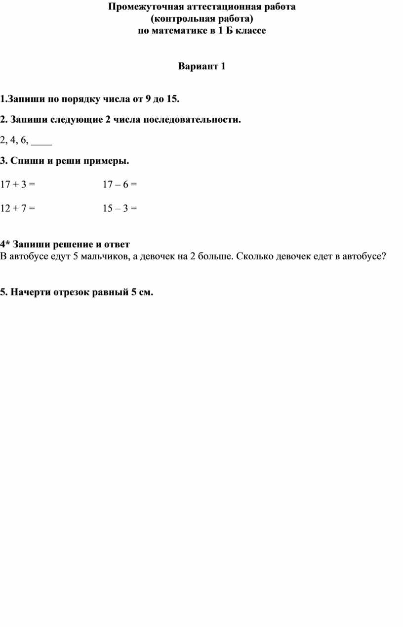 Промежуточная аттестационная работа охватывает содержание, включенное в учебно-методический комплект «Математика», 1 класс.