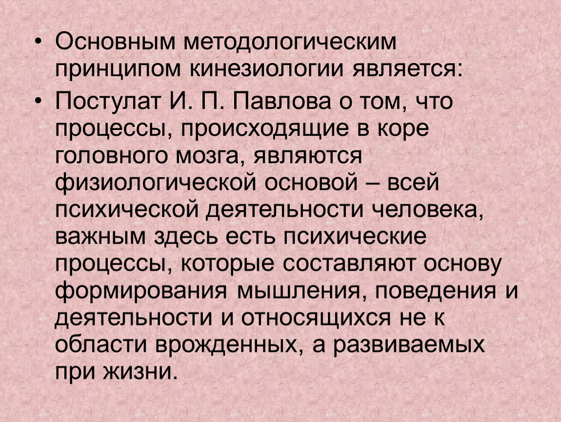 Постулат И. П. Павлова о том, что процессы, происходящие в коре головного мозга, являются физиологической основой – всей психической деятельности человека, важным здесь есть психические процессы, которые составляют основу формирования мышления, поведения и деятельности и относящихся не к области врожденных, а развиваемых при жизни.