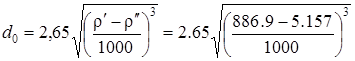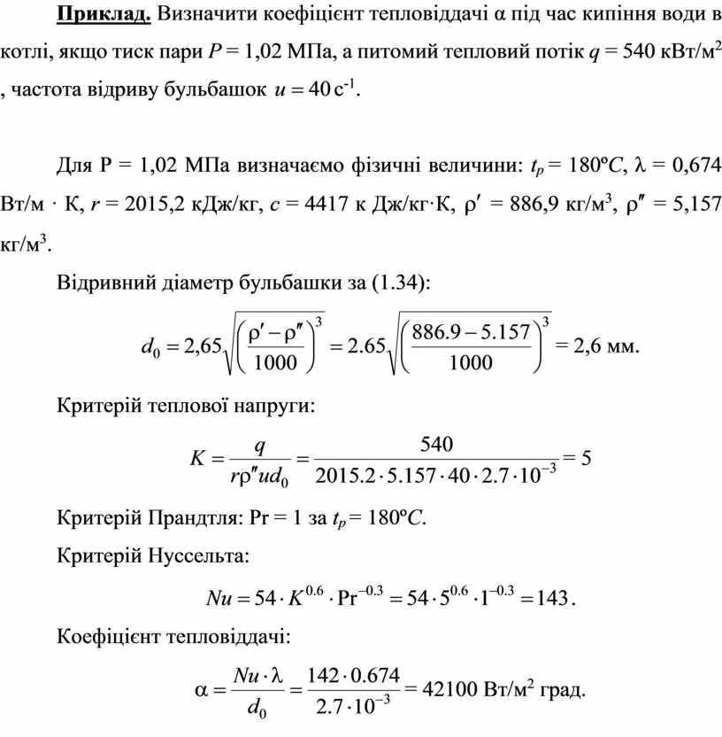 Приклад. Визначити коефіцієнт тепловіддачі α під час кипіння води в котлі, якщо тиск пари Р = 1,02 МПа, а питомий тепловий потік q = 540 кВт/м2 , частота відриву бульбашок