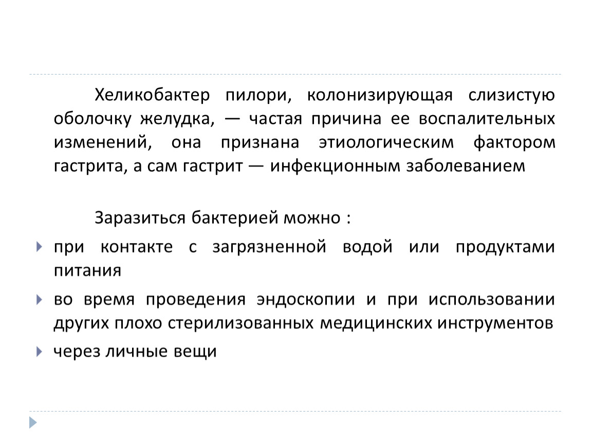 Хеликобактер пилори, колонизирующая слизистую оболочку желудка, — частая причина ее воспалительных изменений, она признана этиологическим фактором гастрита, а сам гастрит — инфекционным заболеванием
