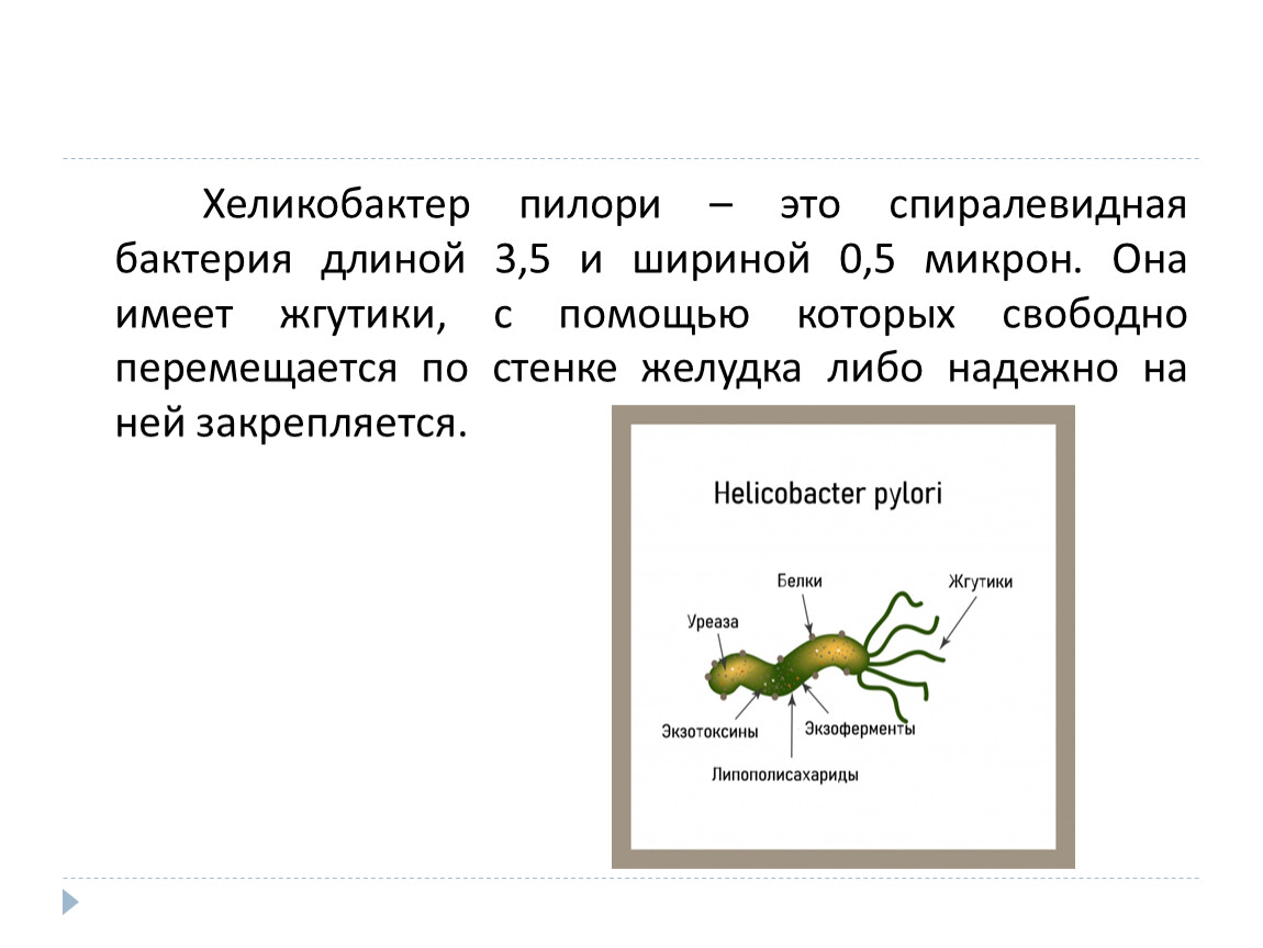 Хеликобактер пилори – это спиралевидная бактерия длиной 3,5 и шириной 0,5 микрон. Она имеет жгутики, с помощью которых свободно перемещается по стенке желудка либо надежно на ней закрепляется.