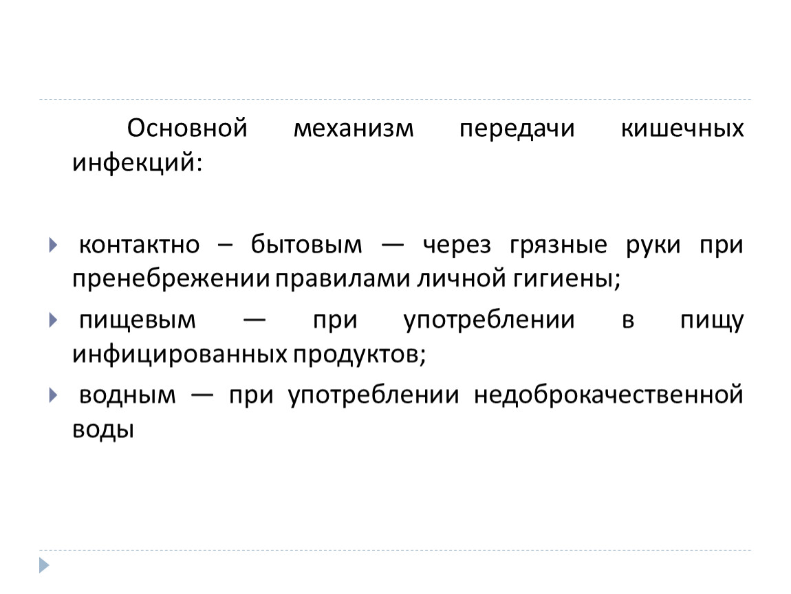 контактно – бытовым — через грязные руки при пренебрежении правилами личной гигиены;
