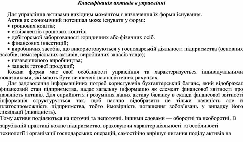 Для управління активами вихідним моментом є визначення їх форми існування.