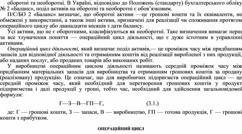 Операційний цикл діяльності, який визначає поділ активів,— це проміжок часу між придбанням запасів для відповідної діяльності та отриманням коштів від реалізації виробленої з них продукції, або наданих послуг, або проданих товарів або виконаних робіт.
