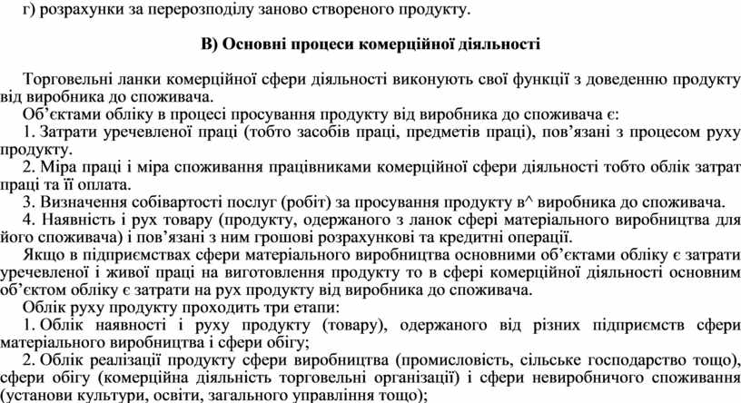 Якщо в підприємствах сфери матеріального виробництва основними об’єктами обліку є затрати уречевленої і живої праці на виготовлення продукту то в сфері комерційної діяльності основним об’єктом обліку є затрати на рух продукту від виробника до споживача.