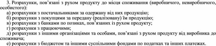 д) розрахунки з іншими організаціями та особами, пов’язані з рухом продукту від виробника до споживача;