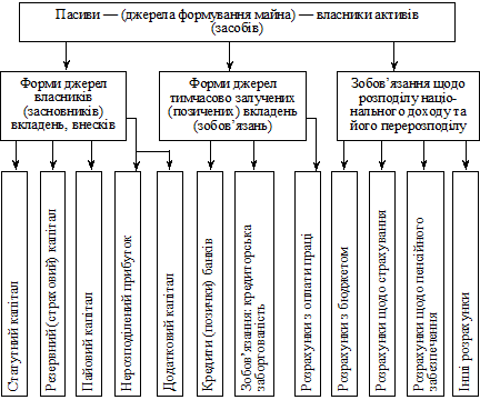 Підприємство легітимне — як юридична особа — є правовласником усіх активів. Але відносно до форми вкладення (внесків) та різних суспільних відносин, визначених законодавством, усі пасиви (тобто сума пасивів) поділяється на дві групи: