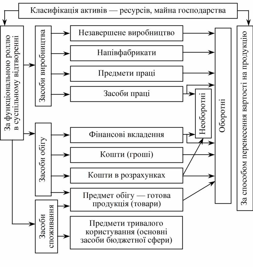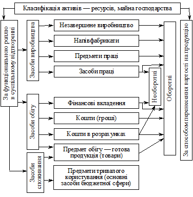 Активи (ресурси) господарства поділяються на нематеріальні та матеріальні. Матеріальні активи в свою чергу, поділяються на дві групи — засоби виробництва та засоби обігу (обертання). Спеціальну групу активів формують фінансові вкладення (інвестиції).