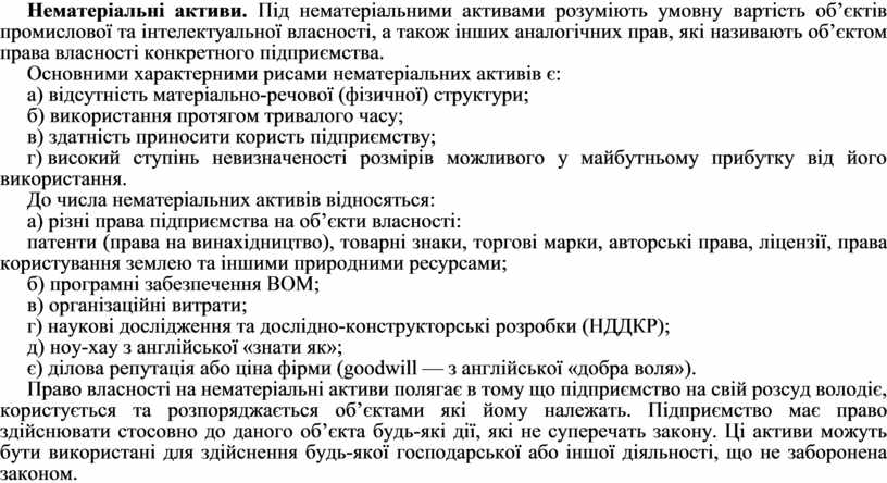 Нематеріальні активи. Під нематеріальними активами розуміють умовну вартість об’єктів промислової та інтелектуальної власності, а також інших аналогічних прав, які називають об’єктом права власності конкретного підприємства.