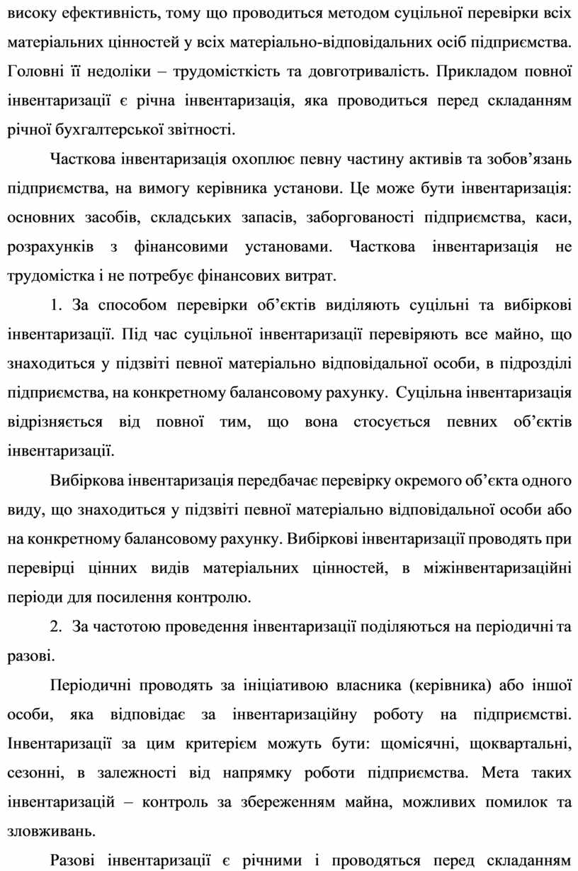 високу ефективність, тому що проводиться методом суцільної перевірки всіх матеріальних цінностей у всіх матеріально-відповідальних осіб підприємства. Головні її недоліки – трудомісткість та довготривалість. Прикладом повної інвентаризації є річна інвентаризація, яка проводиться перед складанням річної бухгалтерської звітності.
