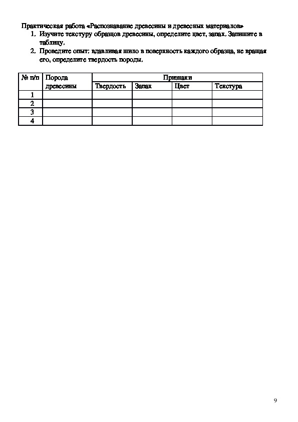 1. Изучите текстуру образцов древесины, определите цвет, запах. Запишите в