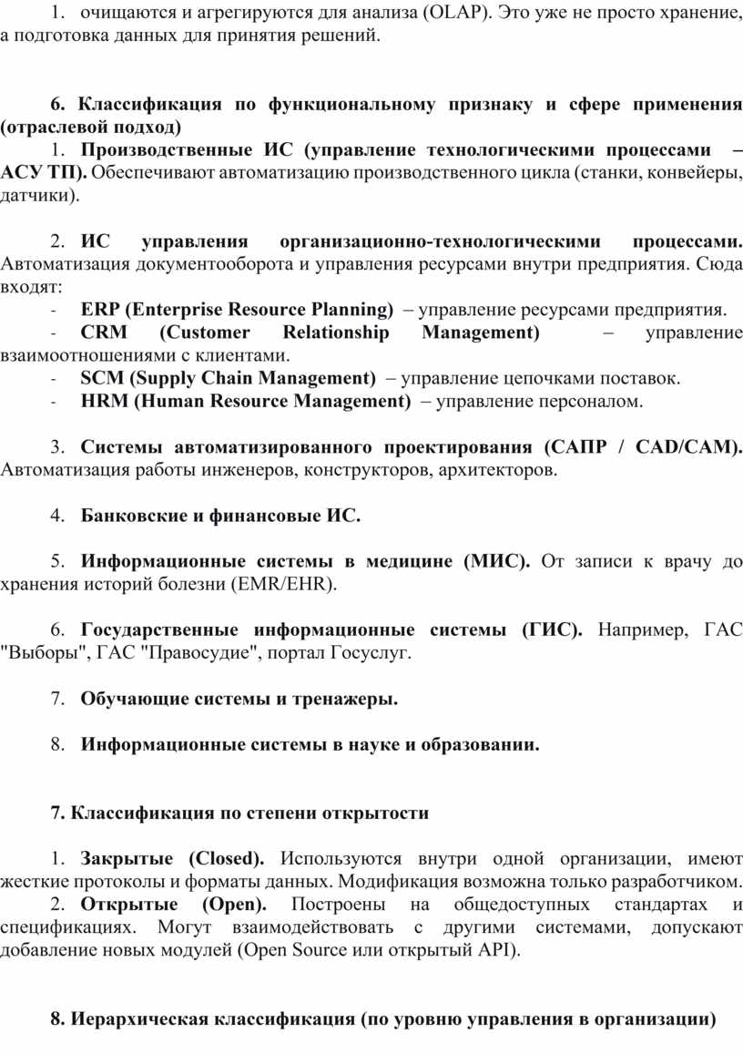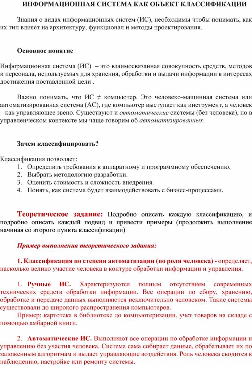 3. Автоматизированные ИС (АИС). Наиболее распространенный в настоящее время класс систем. Они предполагают активное участие человека в контуре управления, особенно на этапе принятия ключевых решений. Компьютер берет на себя рутинные операции, обработку больших массивов данных и сложные вычисления, но окончательное решение или корректировку курса выполняет человек-оператор. Именно этот класс является основным объектом изучения в курсах по информационным системам.