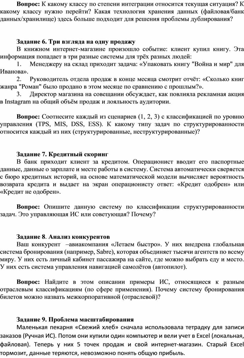 Вопрос: Соотнесите каждый из сценариев (1, 2, 3) с классификацией по уровню управления (TPS, MIS, DSS, ESS). К какому типу задач по структурированности относится каждый из них (структурированные, неструктурированные)?