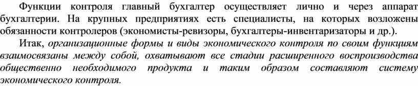 Функции контроля главный бухгалтер осуществляет лично и через аппарат бухгалтерии. На крупных предприятиях есть специалисты, на которых возложены обязанности контролеров (экономисты-ревизоры, бухгалтеры-инвентаризаторы и др.).
