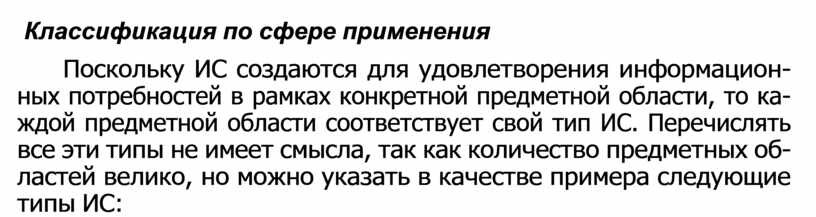 Поскольку ИС создаются для удовлетворения информацион- ных потребностей в рамках конкретной предметной области, то ка- ждой предметной области соответствует свой тип ИС. Перечислять все эти типы не имеет смысла, так как количество предметных об- ластей велико, но можно указать в качестве примера следующие типы ИС: