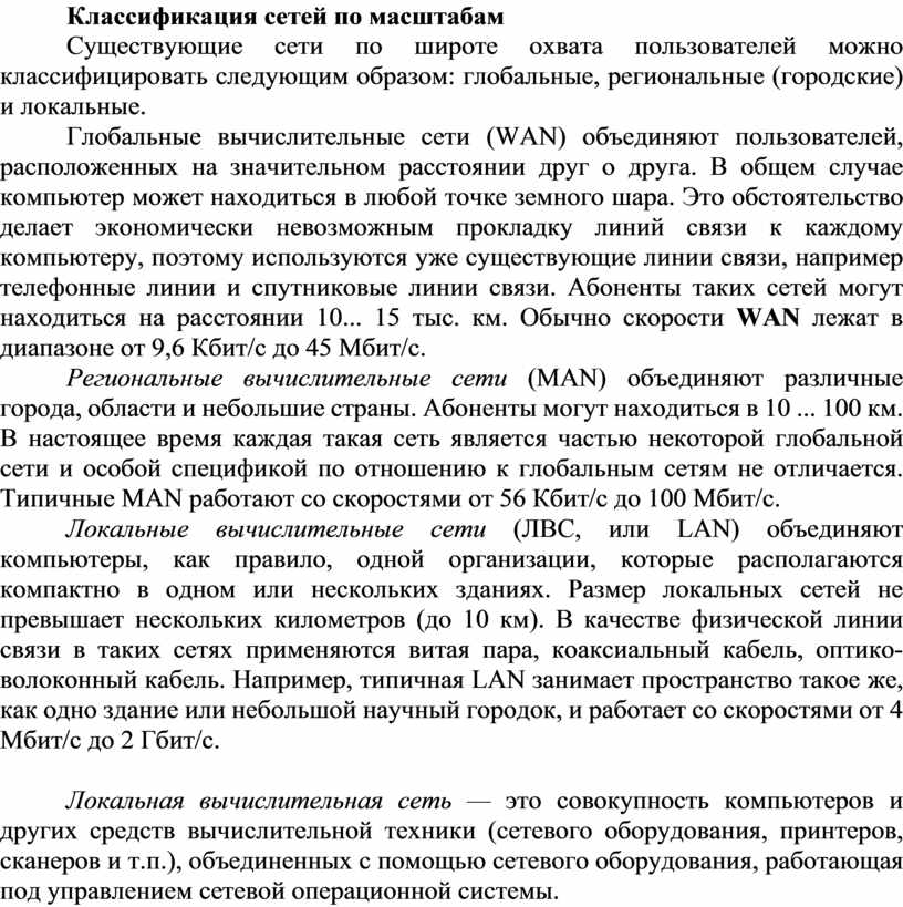 Существующие сети по широте охвата пользователей можно классифицировать следующим образом: глобальные, региональные (городские) и локальные.