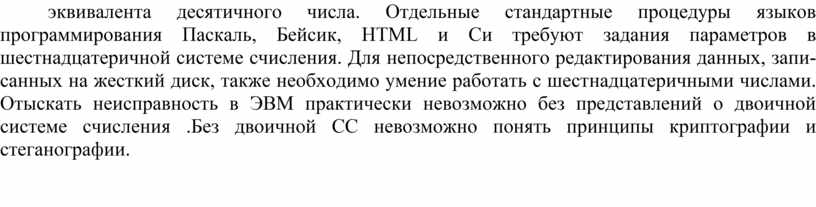 Задача перевода из одной системы счисления в другую часто встречается при программировании и особенно часто при программировании на языке Ассемблера. Например, при определении адреса ячейки памяти, для получения двоичного или шестнадцатеричного эквивалента десятичного числа. Отдельные стандартные процедуры языков программирования Паскаль, Бейсик, HTML и Си требуют задания параметров в шестнадцатеричной системе счисления. Для непосредственного редактирования данных, записанных на жесткий диск, также необходимо умение работать с шестнадцатеричными числами. Отыскать неисправность в ЭВМ практически невозможно без представлений о двоичной системе счисления .Без двоичной СС невозможно понять принципы криптографии и стеганографии.