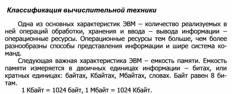 Следующая важная характеристика ЭВМ – емкость памяти. Емкость памяти измеряется в двоичных единицах информации – битах, или кратных единицах: байтах, Кбайтах, Мбайтах, словах. Байт равен 8 би- там.