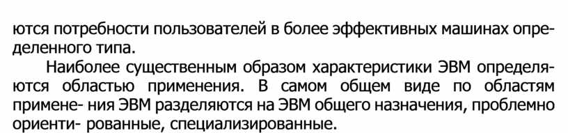 Наиболее существенным образом характеристики ЭВМ определя- ются областью применения. В самом общем виде по областям примене- ния ЭВМ разделяются на ЭВМ общего назначения, проблемно ориенти- рованные, специализированные.