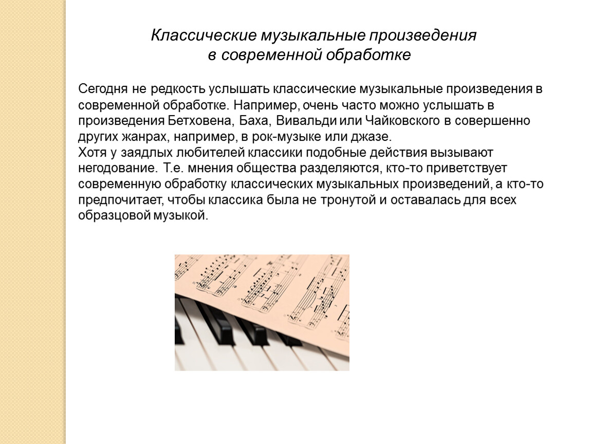 Сегодня не редкость услышать классические музыкальные произведения в современной обработке. Например, очень часто можно услышать в произведения Бетховена, Баха, Вивальди или Чайковского в совершенно других жанрах, например, в рок-музыке или джазе.