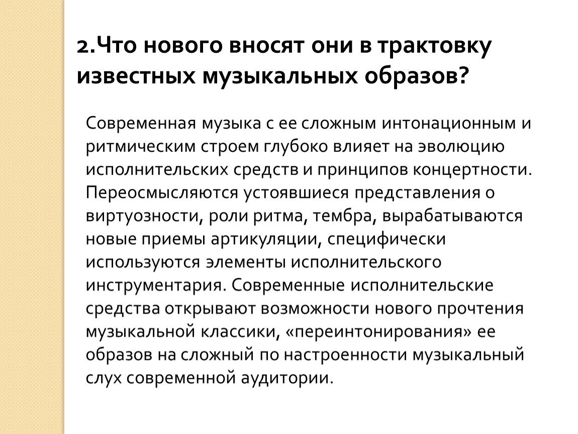 Современная музыка с ее сложным интонационным и ритмическим строем глубоко влияет на эволюцию исполнительских средств и принципов концертности. Переосмысляются устоявшиеся представления о виртуозности, роли ритма, тембра, вырабатываются новые приемы артикуляции, специфически используются элементы исполнительского инструментария. Современные исполнительские средства открывают возможности нового прочтения музыкальной классики, «переинтонирования» ее образов на сложный по настроенности музыкальный слух современной аудитории.