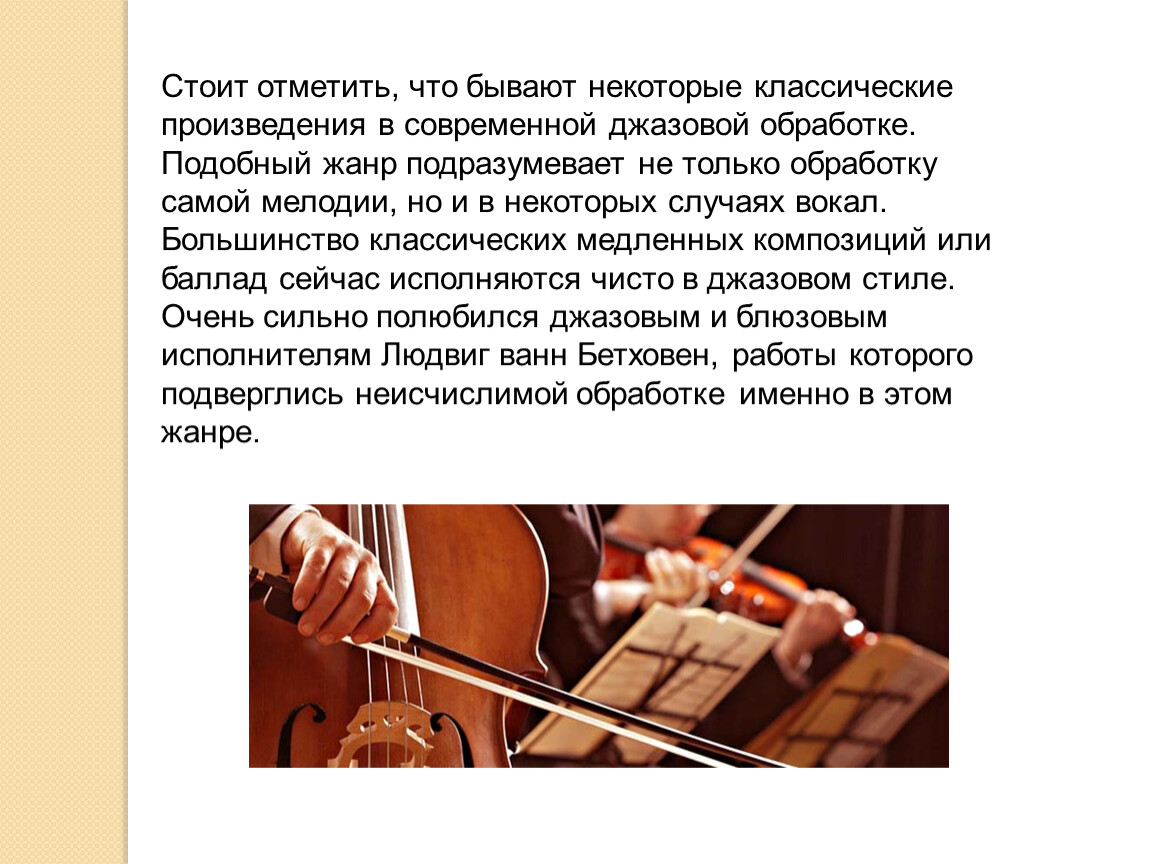 Стоит отметить, что бывают некоторые классические произведения в современной джазовой обработке. Подобный жанр подразумевает не только обработку самой мелодии, но и в некоторых случаях вокал. Большинство классических медленных композиций или баллад сейчас исполняются чисто в джазовом стиле. Очень сильно полюбился джазовым и блюзовым исполнителям Людвиг ванн Бетховен, работы которого подверглись неисчислимой обработке именно в этом жанре.