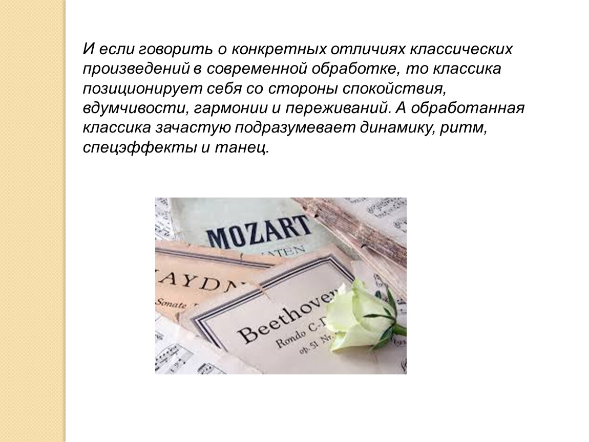 И если говорить о конкретных отличиях классических произведений в современной обработке, то классика позиционирует себя со стороны спокойствия, вдумчивости, гармонии и переживаний. А обработанная классика зачастую подразумевает динамику, ритм, спецэффекты и танец.