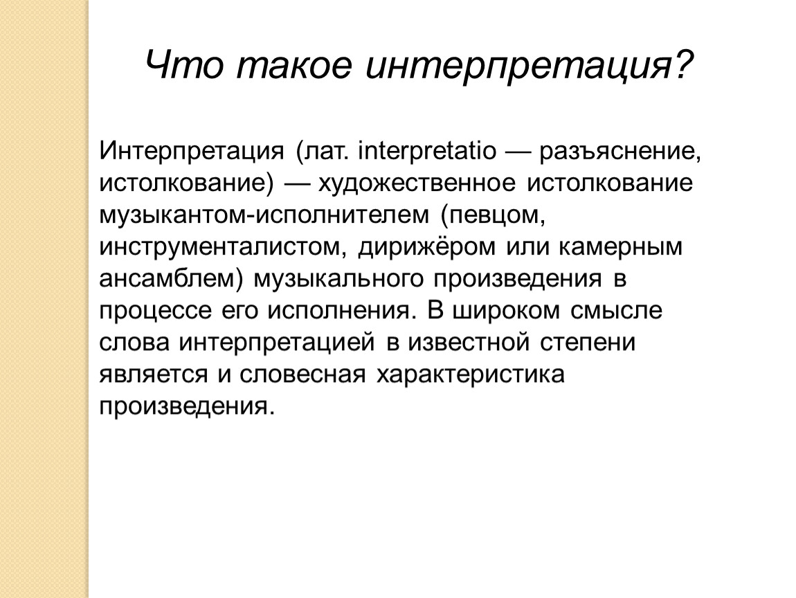 Интерпретация (лат. interpretatio — разъяснение, истолкование) — художественное истолкование музыкантом-исполнителем (певцом, инструменталистом, дирижёром или камерным ансамблем) музыкального произведения в процессе его исполнения. В широком смысле слова интерпретацией в известной степени является и словесная характеристика произведения.