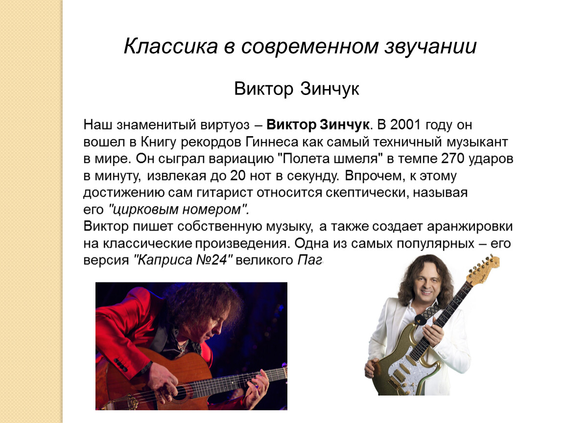 Наш знаменитый виртуоз – Виктор Зинчук. В 2001 году он вошел в Книгу рекордов Гиннеса как самый техничный музыкант в мире. Он сыграл вариацию "Полета шмеля" в темпе 270 ударов в минуту, извлекая до 20 нот в секунду. Впрочем, к этому достижению сам гитарист относится скептически, называя его "цирковым номером".