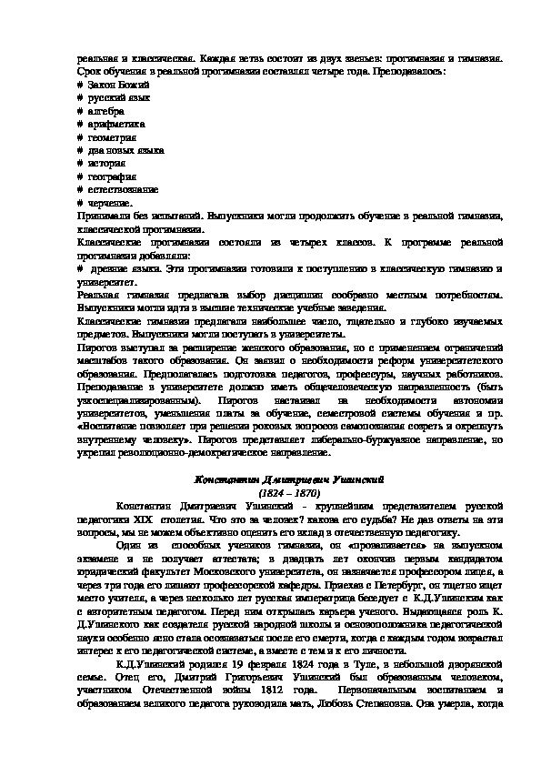 соединение обучения с ремесленным трудом. Далее две ветви среднего образования реальная и классическая. Каждая ветвь состоит из двух звеньев: прогимназия и гимназия.
