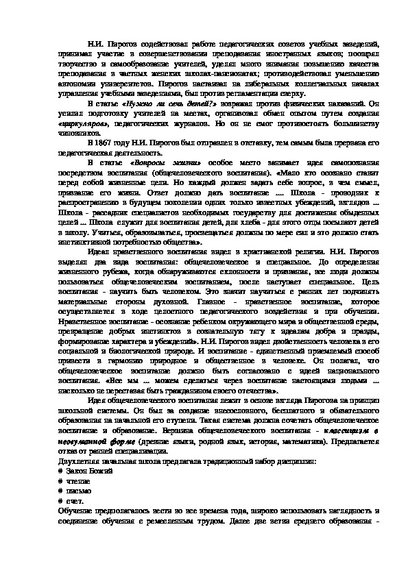 Идея общечеловеческого воспитания лежит в основе взгляда Пирогова на принцип